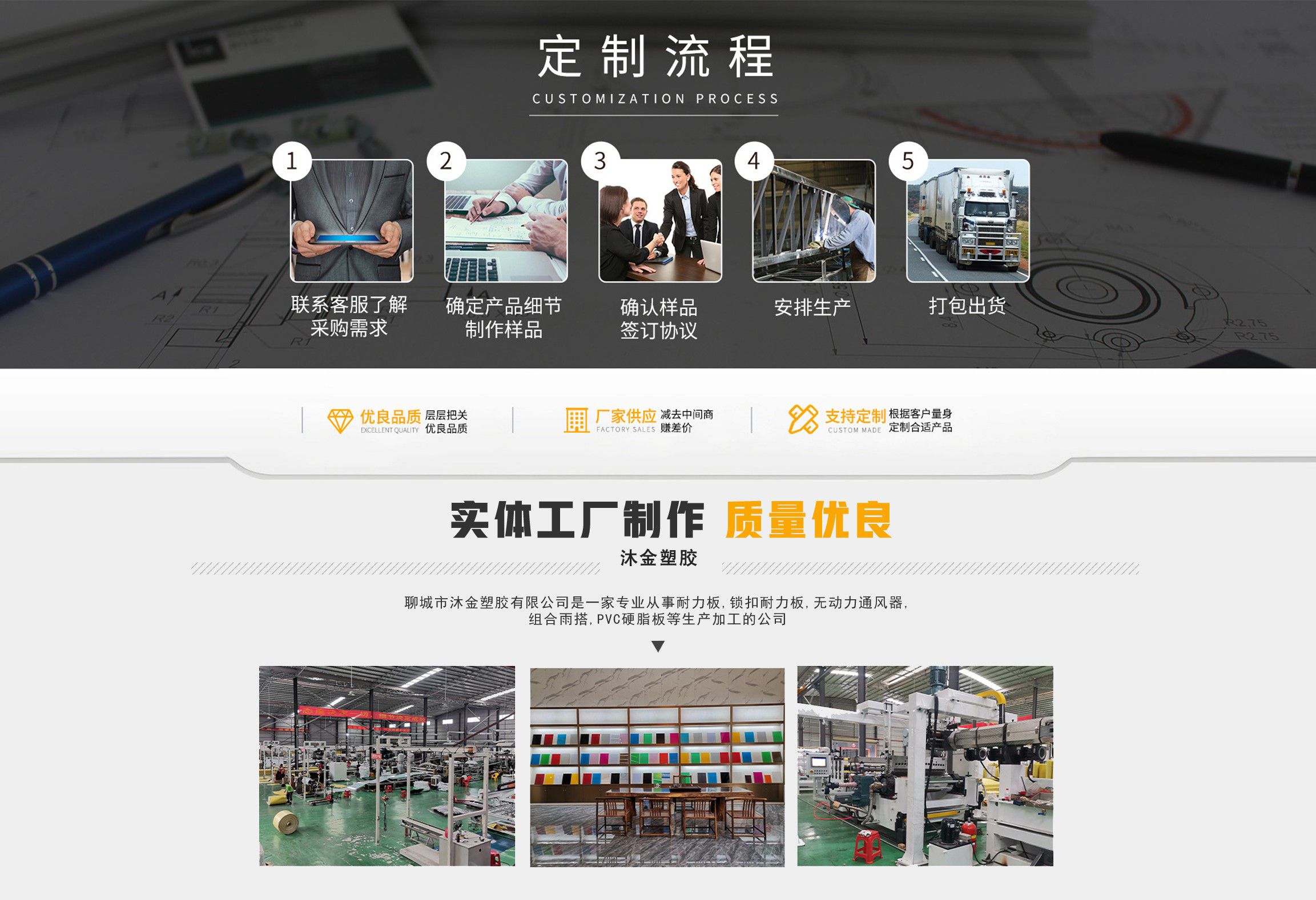 聊城市沐金塑膠有限公司注冊資金2180萬元,占地20000余平方,擁有自建廠房15000平方,員工100余名。10余年來,公司主營耐力板,鎖扣耐力板,耐力板深加工,無動力通風器,組合雨搭,PVC硬脂板,耐力板廠家等板材的發展戰略,逐漸成長為綜合性企業。 公司擁有多條板材共擠生產線,采用世界知名品牌進口原材料和先進工藝,依據完善的ISO9001質量管理體系和ISO14001環境管理體系,為產品的卓越品質提供了強有力的保證。憑借過硬的創新能力和堅實的硬件基礎,贏創已成為國內領先的熱塑性板材生產商,產品被廣泛應用于建筑業、農業、工業、廣告業、安防行業及DIY領域?! 」臼冀K致力于通過提供最優的板材應用解決方案,為客戶創造最高的價值;堅守創新、質量、靈活、服務和速度的核心價值觀;堅持“完美的產品需要完美服務的支持”的經營理念,努力實現成為世界領先的板材與解決方案供應商的夢想?! ≡谖磥?,公司將立足客戶需求,不斷改變和完善現有產品,拓展產品線和充分開發板材的應用領域,為客戶創造全方位的價值。同時更好地實現員工的價值,實現公司團隊的價值。我們將與您一起創贏未來! 企業使命:成為世界領先的板材與解決方案供應商?! 」驹妇埃和ㄟ^提供最優的板材應用解決方案,為客戶創造最高的價值。 核心價值觀:質量...